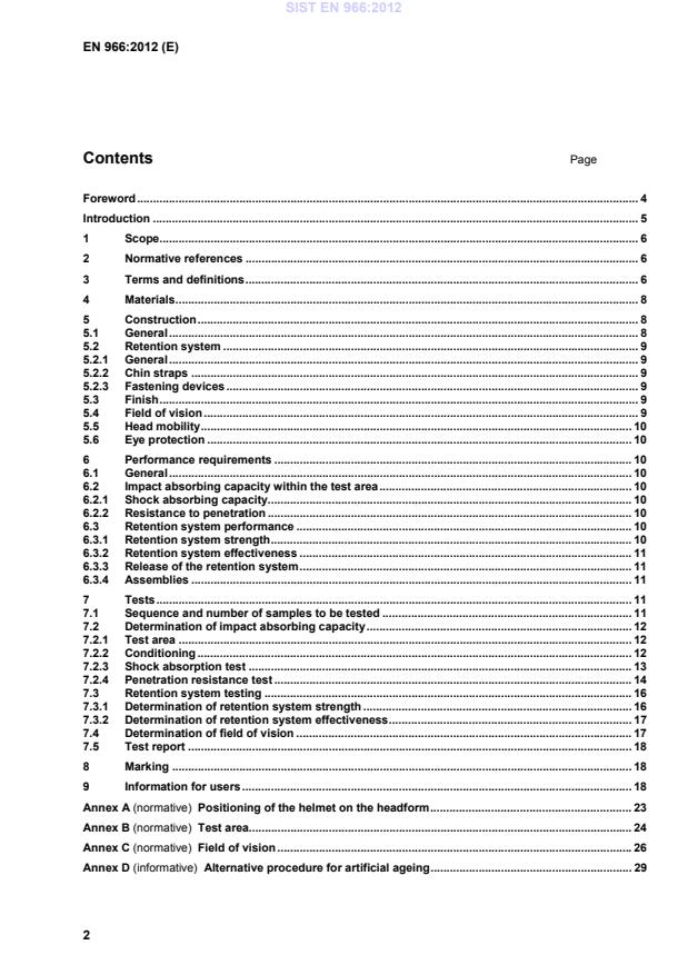 EN 966:2012 is a standard published by the European Committee for Standardization (CEN). Its full title is "Helmets for airborne sports". This standard covers: This European Standard specifies requirements and test methods for protective helmets used in paragliding, hang gliding and flying with ultra-light aeroplanes. Helmets for airborne sports are indicated in this European Standard as follows: - category HPG: Helmets for paragliding and hang gliding; - category UL: Helmets for flying with ultra-light aeroplanes. Requirements and the corresponding methods of test, where appropriate, are given for the following: - construction including chin strap, fastening devices, field of vision, head mobility and eye protection; - penetration resistance; - shock-absorbing properties; - retention system properties; - marking and information for users. NOTE The requirements cover both categories. Special requirements are contained in the relevant clauses. This European Standard does not apply to other kinds of head protection used in airborne sports.