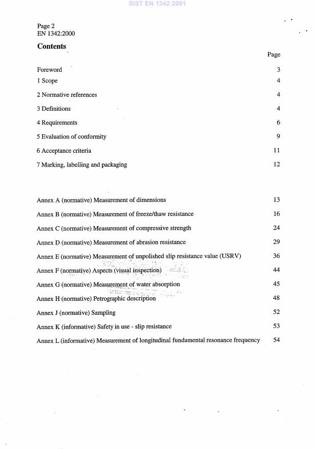 EN 1342:2000 is a standard published by the European Committee for Standardization (CEN). Its full title is "Setts of natural stone for external paving - Requirements and test methods". This standard covers: This European standard specifies the performance requirements and the corresponding test methods for all natural stone setts for external paving use. It provides for product marking and for the evaluation of conformity of the product to this European Standard. This European Standard also covers characteristics that are of importance to the trade. It does not cover the effect of de-icing salts.