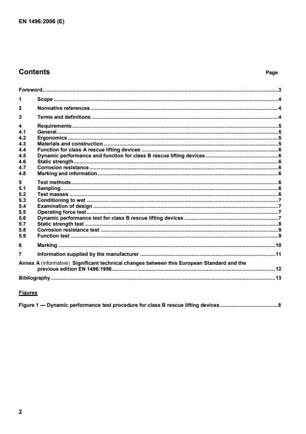 Page Foreword.3 1 Scope.4 2 Normative references.4 3 Terms and definitions.4 4 Requirements.5 4.1 General.5 4.2 Ergonomics.5 4.3 Materials and construction.5 4.4 Function for class A rescue lifting devices.6 4.5 Dynamic performance and function for class B rescue lifting devices.6 4.6 Static strength.6 4.7 Corrosion resistance.6 4.8 Marking and information.6 5 Test methods.6 5.1 Sampling.6 5.2 Test masses.6 5.3 Conditioning to wet.7 5.4 Examination of design.7 5.5 Operating force test.7 5.6 Dynamic performance test for class B rescue lifting devices.7 5.7 Static strength test.8 5.8 Corrosion resistance test.9 5.9 Function test.9 6 Marking.10 7 Information supplied by the manufacturer.11 Annex A (informative)