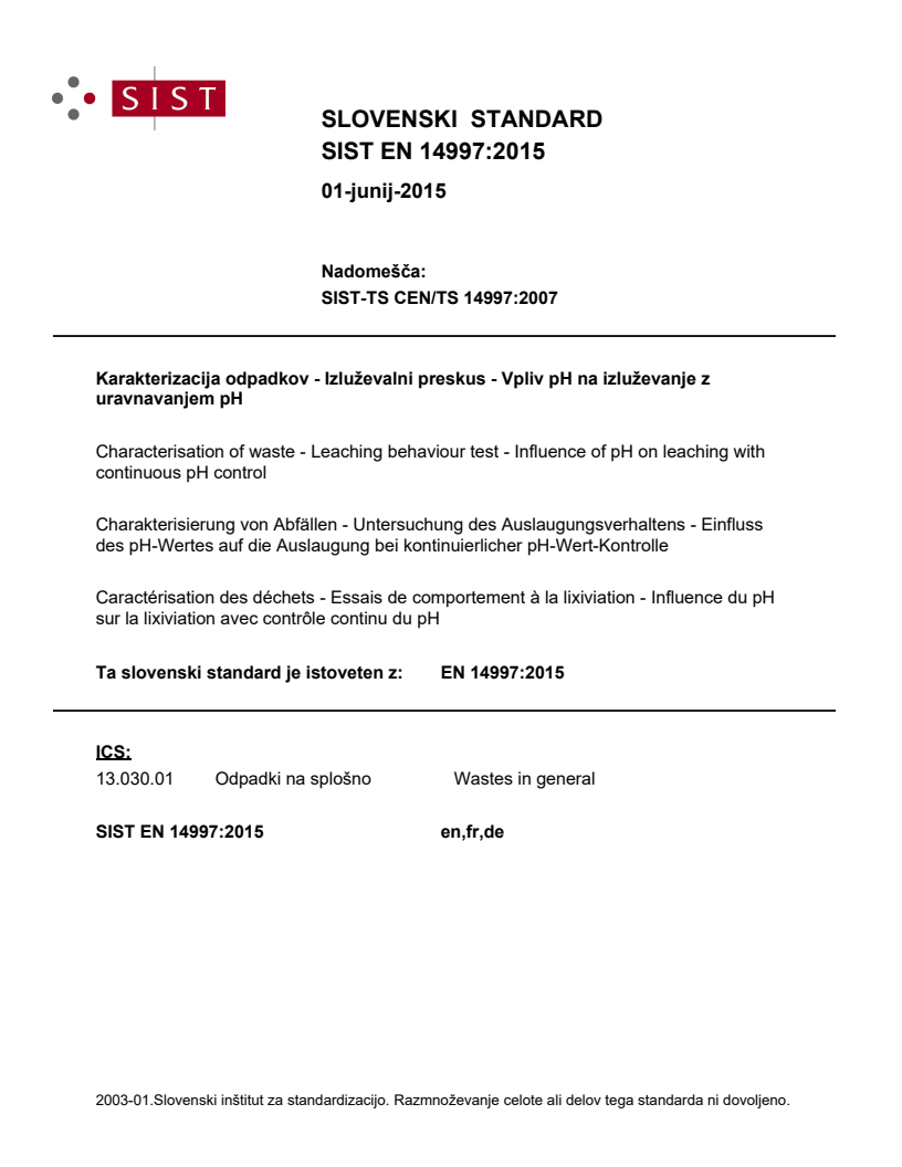 2003-01.Slovenski inštitut za standardizacijo. Razmnoževanje celote ali delov tega standarda ni dovoljeno.Karakterizacija odpadkov - Izluževalni preskus - Vpliv pH na izluževanje z uravnavanjem pHCharakterisierung von Abfällen - Untersuchung des Auslaugungsverhaltens - Einfluss des pH-Wertes auf die Auslaugung bei kontinuierlicher pH-Wert-KontrolleCaractérisation des déchets - Essais de comportement à la lixiviation - Influence du pH sur la lixiviation avec contrôle continu du pHCharacterisation of waste - Leaching behaviour test - Influence of pH on leaching with continuous pH control13.030.01Odpadki na splošnoWastes in generalICS:Ta slovenski standard je istoveten z:EN 14997:2015SIST EN 14997:2015en,fr,de01-junij-2015SIST EN 14997:2015SLOVENSKI