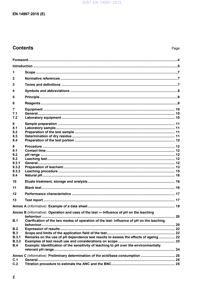 Operation and uses of the test — Influence of pH on the leaching behaviour . 20 B.1 Clarification of the two modes of operation of the test: influence of pH on the leaching behaviour . 20 B.2 Expression of results . 22 B.3 Scope and limits of the application field of the test . 22 B.3.1 Remarks on the use of pH dependence test results to assess the effects of ageing . 22 B.3.2 Examples of test result use and considerations on scope . 23 B.4 Example: Identification of the sensitivity of leaching to pH over the environmentally relevant pH range. 24 Annex C (informative)