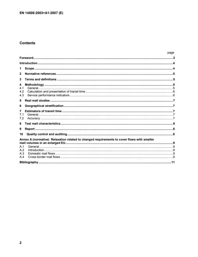 This European Standard refers to a number of principles and minimum requirements to be applied for the measurement of the transit time of the national and cross-border mail. This European Standard for single piece non-priority mail has been developed from EN 13850:2002 Postal Services - Quality of Service - Measurement of the transit time of end-to-end services for single piece priority mail and first class mail. Both standards consider methods using a representative end-to-end sample of addressed letter mail. The additional specifications in this European Standard are required to define the minimum confidence levels for the measurement of non-priority mail. !When EN 14508 was developed it was decided to base it on existing measuring systems already in use among the European Union member states. Since the publication of EN 14508 in 2003 more countries have joined the European Union which have increased the number of cross-border mail flows significantly and therefore made it necessary to adapt the standard accordingly. Amendment 1 to this European Standard has been developed to make it possible to economically measure a larger number of mail flows from a wider range of countries than the original versions of the standard was made for. Amendment 1 to this European Standard gives information on how to categorize mail flows for measuring purposes and explain how required accuracy for small and medium sized mail flows can be obtained by measuring under a consecutive number of years." 1 Scope In addition to EN 13850:2002 Postal Services - Quality of Service - Measurement of the transit time of end-to-end services for single piece priority mail and first class mail, this European Standard specifies methods for measuring the end-to-end transit time of domestic and cross-border non-priority single piece mail, collected, processed and distributed by postal service operators. It considers methods using a representative end-to-end sample of all types of single piece addressed letter mail. This European Standard has been developed from and is compatible with the requirements of EN 13850:2002. As such, surveys for both priority and non-priority single piece mail may be undertaken concurrently whilst reporting separate estimates of priority and non-priority transit times.