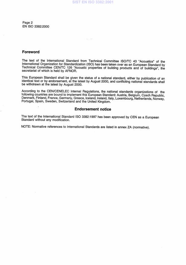 EN ISO 3382:2000 is a standard published by the European Committee for Standardization (CEN). Its full title is "Acoustics - Measurements of the reverberation time of rooms with reference to other acoustical parameters (ISO 3382:1997)". This standard covers: This document specifies methods for the measurement of reverberation time in rooms. It is not restricted to auditoria or concert halls; it is also applicable to rooms intended for speech and music or where noise protection is a consideration. It describes the measurement procedure, the apparatus needed, the coverage required, and the method of evaluating the data and presenting the test report. Furthermore, it is intended for application of modern digital measuring techniques and for evaluation of room acoustical parameters derived from impulse responses.