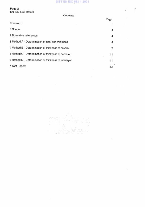 EN ISO 583-1:1999 is a standard published by the European Committee for Standardization (CEN). Its full title is "Conveyor belts with a textile carcass - Total thickness and thickness of elements - Part 1: Methods of test (ISO 583-1:1999)". This standard covers: This European Standard describes four methods for the measurement of thickness of conveyor belts having a textile carcass. Method A describes a method for the determination of total belt thickness. Method B describes a method for the determination of thickness of covers. Method C describes a method for the determination of thickness of carcass. Method D describes a method for the determination of the thickness of the interlayers.