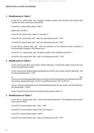 cac:TaxScheme/cbc:ID = "VAT" 2 Modification to Table 4 − In line /Invoice/cbc:Note, last column, add the following " Prepend the subject code in the note element using #subject code#." − In line /Invoice/cac:AdditionalDocumentReference/cbc:ID, last column, add the following " Use cbc:DocumentTypeCode = “130” − In line, /Invoice/cac:AccountingSupplierParty/cac:Party/cac:PartyTaxScheme/cac:TaxScheme/cbc:ID, last column, add the following " for BT-31 and different from “VAT” for BT-32." − In line, /Invoice/cac:PayeeParty/cac:PartyIdentification/cbc:ID, last column, add the following " Use @schemeID = “SEPA” − In line /Invoice/cac:InvoiceLine/cac:Item/cbc:Description, delete "n" 3 Modifications to Table 5 − In line BT-11, column Rules, add " with cbc:DocumentTypeCode = 50 (Validated priced tender from code list 1001.)" − In line BT-18, column Rules, add " Code = “130” − In line BT-21, column Rules, replace "Use" by "Prepend" − In line BG-3, column Match, delete "CAR 3" − In line BT-48, column Rules, add " with cac:TaxScheme/cbc:ID = “VAT” SIST-TS CEN/TS 16931-3-2:2018/AC:2018