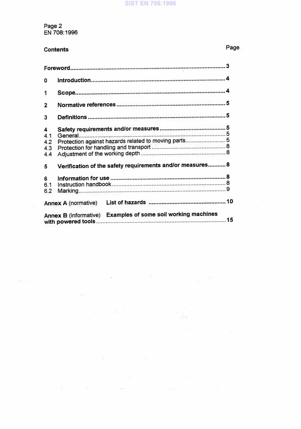 EN 708:1996 is a standard published by the European Committee for Standardization (CEN). Its full title is "Agricultural machinery - Soil working machines with powered tools - Safety". This standard covers: This standard specifies safety requirements and their verification for the design and construction of soil working machines, mounted or trailed, with tools powered by the engine of the tractor or by an auxiliary motor. It is applicable regardless of the type of movement of the tools. This standard is not applicable to: - spading machines; - pedestrian controlled soil working machines; - machines where the tools are driven by movement of the machine over the ground; - machines fitted with a retractable device, making them capable of working between two successive plants in the same row. It describes methods for the elimination or reduction of risks which need specific requirements for soil working machines with powered tools. It does not deal with general hazards particularly general hazards related to mobility. These apects will be dealt with in another standard produced by CEN/TC 144 (see introduction). In addition, it specifies the type of information on safe working practices to be provided by the manufacturer. The list of significant hazards dealt with in this standard is given in Annex A. Annex A also indicates the hazards which have not been dealt with. Note: The measures for safeguarding for the PTO shaft are dealt with in the 'Common requirements' standard being prepared by CEN/TC 144. Environmental aspects have not been considered in this standard. This standard applies primarily to machines which are manufactured after the date of issue of the standard.