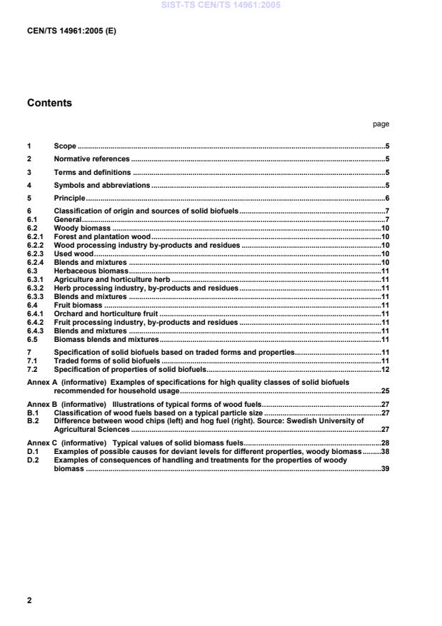 CEN/TS 14961:2005 is a technical specification published by the European Committee for Standardization (CEN). Its full title is "Solid biofuels - Fuel specifications and classes". This standard covers: This Technical Specification determines the fuel quality classes and specifications for solid biofuels. According to the mandate given for the standardisation work, the scope of the Technical Specification (TC335) only includes solid biofuels originating from the following sources: - products from agriculture and forestry; - vegetable waste from agriculture and forestry; - vegetable waste from the food processing industry; - wood waste, with the exception of wood waste which may contain halogenated organic compounds or heavy metals as a result of treatment with wood preservatives or coating, and which includes in particular such wood waste originated from construction and demolition waste; - fibrous vegetable waste from virgin pulp production and from production of paper from pulp, if it is co-incinerated at the place of production and heat generated is recovered; - cork waste. NOTE For the avoidance of doubt, demolition wood is not included in the scope of this Technical Specification. Demolition wood is "used wood arising from demolition of buildings or civil engineering installations" (CEN/TS 14588).
