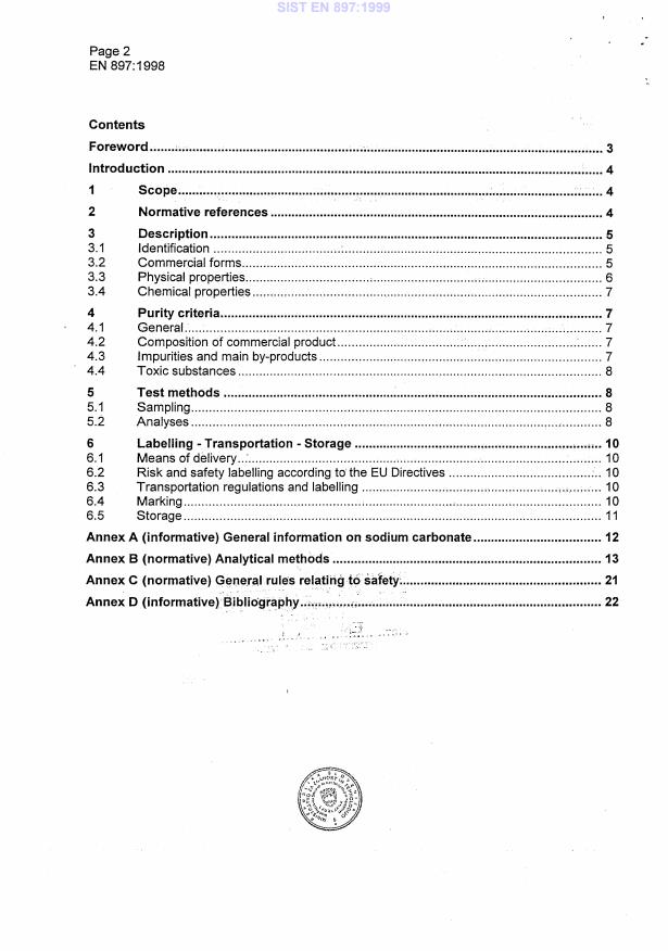 EN 897:1998 is a standard published by the European Committee for Standardization (CEN). Its full title is "Chemicals used for treatment of water intended for human consumption - Sodium carbonate". This standard covers: This European standard is applicable to anhydrous sodium carbonate used for treatment of water intended for human consumption. It describes the characteristics of sodium carbonate and specifies the requirements and the corresponding test methods for sodium carbonate. It gives information on its use in water treatment.