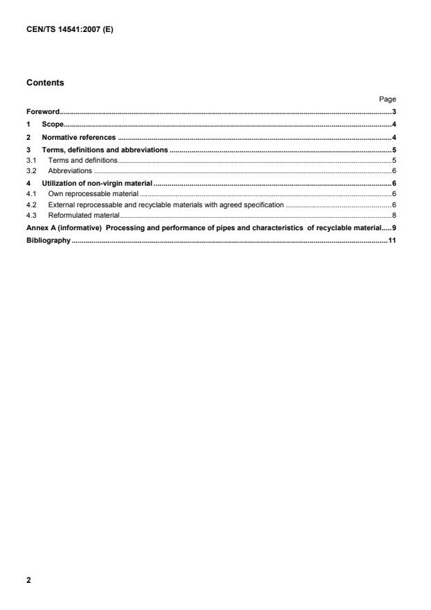CEN/TS 14541:2007 is a technical specification published by the European Committee for Standardization (CEN). Its full title is "Plastics pipes and fittings for non-pressure applications - Utilisation of non-virgin PVC-U, PP and PE materials". This standard covers: This document specifies definitions and recommended specifications and test methods for the utilisation of PVC U, PP and PE non-virgin materials in components for non-pressure piping systems. This document specifies the use of material with agreed specifications in the event that large quantities are to be used. This document gives information concerning the relationship between relevant characteristics and their influence on processing/performance on pipes and/or fittings. NOTE 1 For the purpose of this specification, the term pipes refers to extruded pipes and any parts of a fabricated fitting which is made from an extruded pipe. The term fitting means injection moulded fittings and injection moulded parts of a fabricated fitting. NOTE 2 The product standard should specify the requirements and permitted deviations of the characteristics specified in Table 1, Table 2 and Table 3, as well as permitted dosage levels. NOTE 3 The WG responsible for the product standard should consider those recommendations and only permit dosage levels which comply with the safety requirements of the product standard. Further, the WG should consider whether extra or more frequent product testing is relevant when using such material in the production of pipes and fittings in accordance with the relevant product standard. NOTE 4 For the recycling process, for the testing and the use of the material National and/or European regulations may apply.