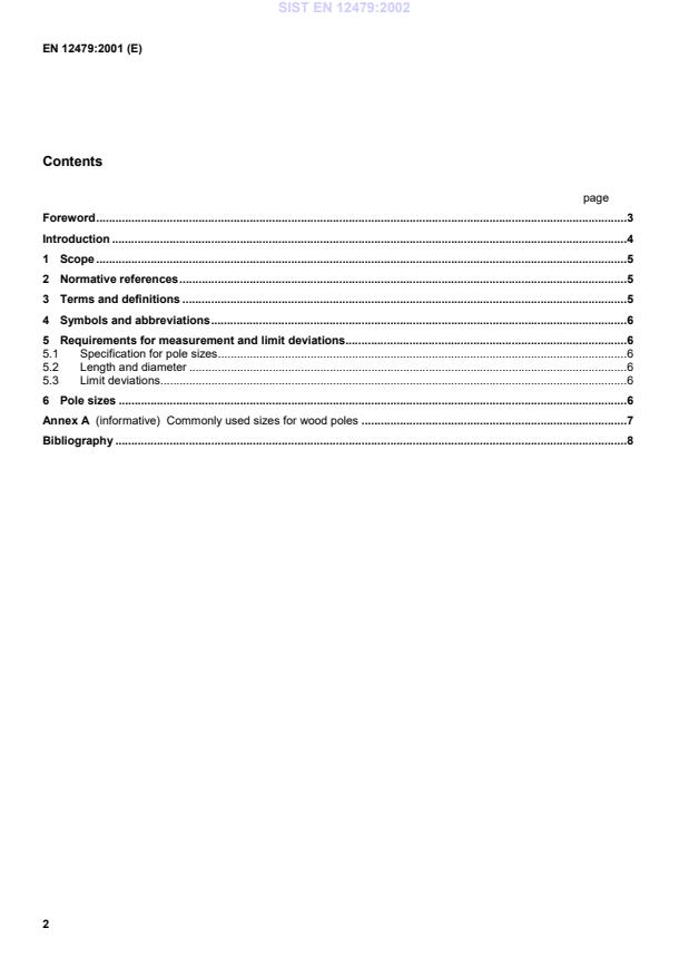 EN 12479:2001 is a standard published by the European Committee for Standardization (CEN). Its full title is "Wood poles for overhead lines - Sizes - Methods of measurement and permissible deviations". This standard covers: This European Standard specifies methods of measuring the sizes of solid wood poles for overhead transmission and telecommunication lines and limit deviations that are taken into account for the acceptance of the poles. It is applicable to both hardwood and softwood poles. This standard covers only single poles under cantilever and/or compression loading. For example, this standard does not cover poles used as beams. The provision of poles for use in any overhead line or cable infrastructure shall take into account a range of factors not covered by this standard which will necessitate the specification by the end user of complementary and synonymous attributes to those defined in this standard. This refers to requirements for a number of factors including safety, overhead plant, handling, fittings, installation machinery and working practices including climbing.