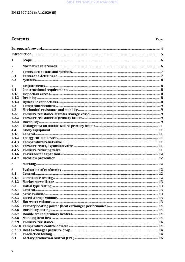 EN 12897:2016+A1 specifies the constructional and performance requirements and methods of test for indirectly heated, unvented (closed) storage water heaters of up to 2 000 l volume suitable for connection to a water supply at a pressure between 0,05 MPa and 1,0 MPa (0,5 bar and 10 bar), and fitted with control and safety devices designed to prevent the temperature of the stored drinking water from reaching 95 °C. Whilst storage water heaters intended primarily for direct heating are not covered by this document, it does allow the provision of electric heating elements for auxiliary use.
