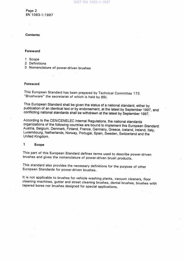 EN 1083-1:1997 is a standard published by the European Committee for Standardization (CEN). Its full title is "Power-driven brushes - Part 1: Definitions and nomenclature". This standard covers: This part of this European Standard defines terms used to describe power- driven brushes and gives the nomenclature of power-driven brush products. This standard also provides the necessary definitions for the purpose of other European Standards for power-driven brushes. It does not include brushes for vehicle washing plants, vacuum cleaners, floor cleaning machines, gutter and street cleaning brushes, dental brushes, brushes with tapered bores nor brushes designed for special applications.