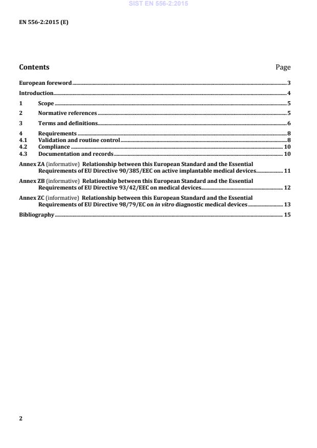 EN 556-2:2015 is associated with the following European legislation: EU Directives/Regulations: 90/385/EEC, 93/42/EEC, 98/79/EC; Standardization Mandates: M/252, M/BC/CEN/89/9. When a standard is cited in the Official Journal of the European Union, products manufactured in conformity with it benefit from a presumption of conformity with the essential requirements of the corresponding EU directive or regulation.