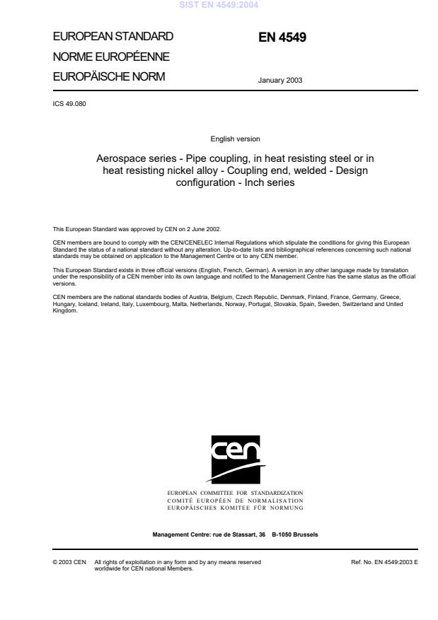 B-1050 Brussels© 2003 CENAll rights of exploitation in any form and by any means reservedworldwide for CEN national Members.Ref. No. EN 4549:2003 ESIST EN 4549:2004