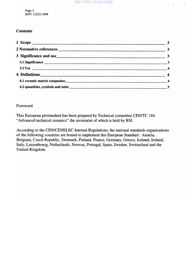 ENV 13233:1998 is a standardization document published by the European Committee for Standardization (CEN). Its full title is "Advanced technical ceramics - Ceramic composites - Notations and symbols". This standard covers: This ENVXXXX defines ceramic matrix composite materials with continuous reinforcements. This pre-standard specifies the notations to be used for the mutually perpendicular directions 1,2,3 of ceramic matrix composites. It sets the rules for writing the symbols and the quantities which characterise the mechanical and thermal properties of these materials. This pre-standard assumes that definitions given in ISO 31-3 and ISO 31-4 are already known. This pre-standard explains how test specimens shall be taken from the material.