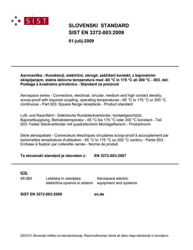 2003-01.Slovenski inštitut za standardizacijo. Razmnoževanje celote ali delov tega standarda ni dovoljeno.Luft- und Raumfahrt - Elektrische Rundsteckverbinder, kontaktgeschützt, Bajonettkupplung, Betriebstemperatur - 65 °C bis 175 °C oder 200 °C konstant - Teil 003: Fester Steckverbinder mit quadratischem Montageflansch - ProduktnormSérie aérospatiale - Connecteurs électriques circulaires scoop-proof à accouplement par baïonnettes température d'utilisation - 65 °C to 175 °C ou 200 °C continu - Partie 003 : Embase à fixation par collerette carrée - Norme de produitAerospace series - Connectors, electrical, circular, medium and high contact density, scoop-proof with bayonet coupling, operating temperatures - 65 °C to 175 °C or 200 °C continuous - Part 003: Square flange receptacle - Product standard49.060Aerospace electric equipment and systemsICS:Ta slovenski standard je istoveten z:EN 3372-003:2007SIST EN 3372-003:2009en,de01-julij-2009SIST EN 3372-003:2009SLOVENSKI