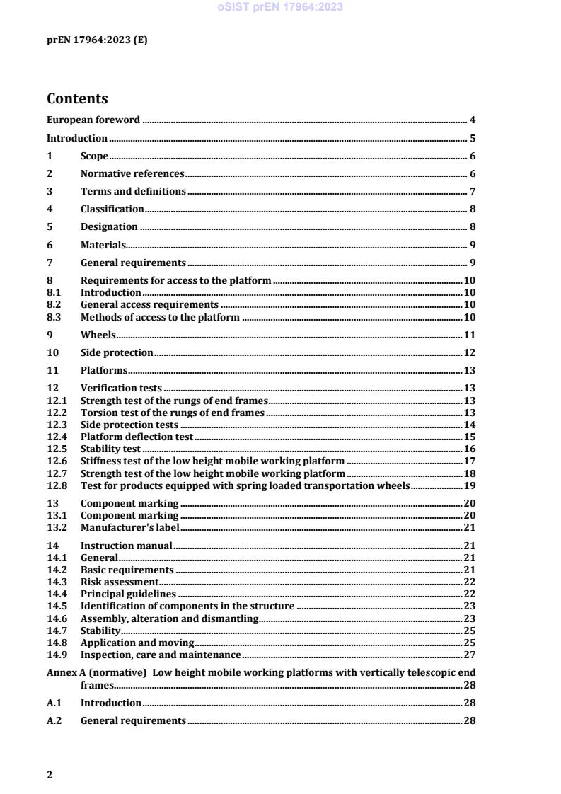 Keywords: prEN 17964, low height mobile working platforms, mobile working platforms up to 2 m, CEN, design loads, safety requirements, materials, dimensions, temporary work equipment.