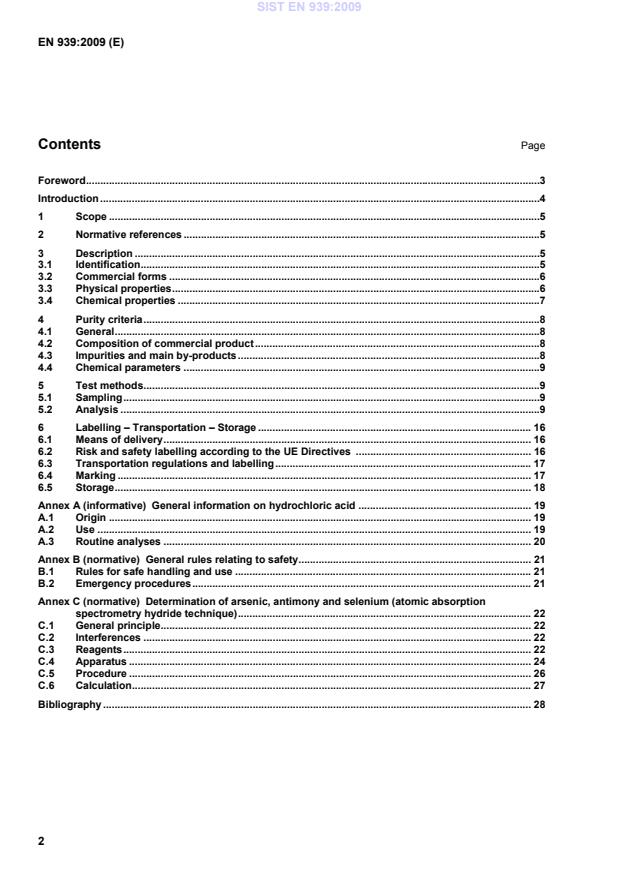 EN 939:2009 is a standard published by the European Committee for Standardization (CEN). Its full title is "Chemicals used for treatment of water intended for human consumption - Hydrochloric acid". This standard covers: This European Standard is applicable to hydrochloric acid used for treatment of water intended for human consumption. It describes the characteristics of hydrochloric acid and specifies the requirements and the corresponding test methods for hydrochloric acid. It gives information on its use in water treatment. It also determines the rules relating to safe handling and use of hydrochloric acid (see Annex B).