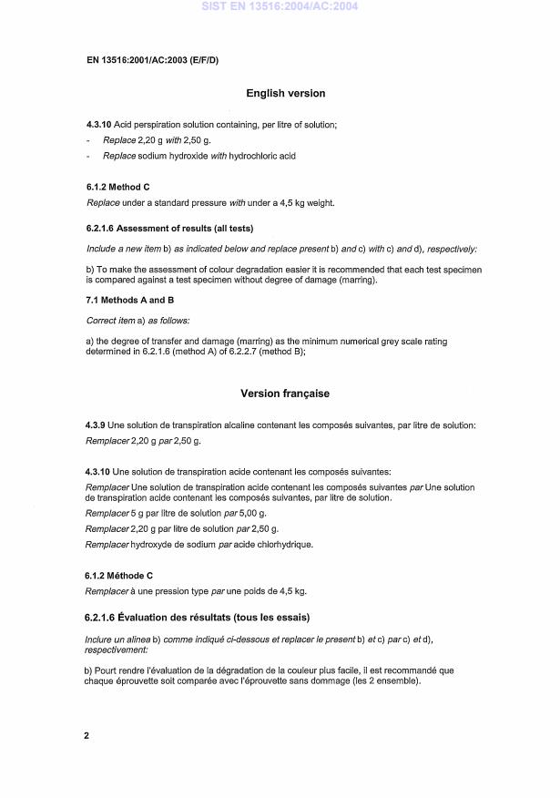 EN 13516:2001/AC:2003 is a corrigendum published by the European Committee for Standardization (CEN). Its full title is "Footwear - Test methods for uppers, lining and insocks - Colour fastness to rubbing". This standard covers: TC - Corrections in 4.3.10, 6.1.2, 6.2.1.6 and 7.1 of the English and French versions