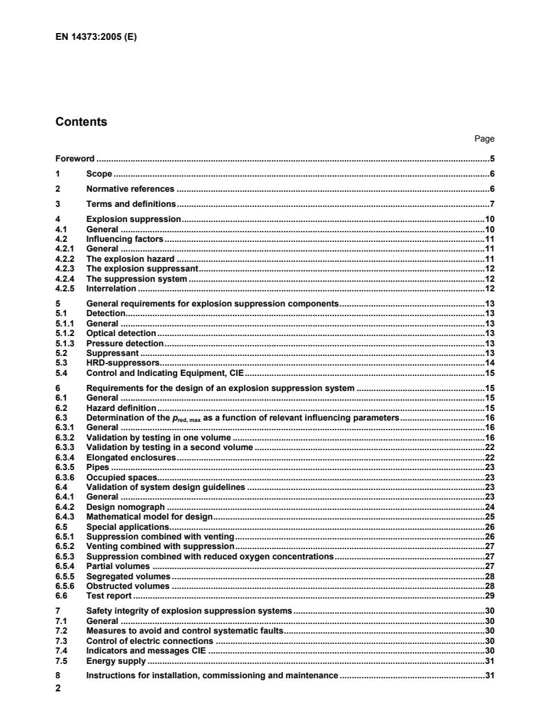 Page Foreword.5 1 Scope.6 2 Normative references.6 3 Terms and definitions.7 4 Explosion suppression.10 4.1 General.10 4.2 Influencing factors.11 4.2.1 General.11 4.2.2 The explosion hazard.11 4.2.3 The explosion suppressant.12 4.2.4 The suppression system.12 4.2.5 Interrelation.12 5 General requirements for explosion suppression components.13 5.1 Detection.13 5.1.1 General.13 5.1.2 Optical detection.13 5.1.3 Pressure detection.13 5.2 Suppressant.13 5.3 HRD-suppressors.14 5.4 Control and Indicating Equipment, CIE.15 6 Requirements for the design of an explosion suppression system.15 6.1 General.15 6.2 Hazard definition.15 6.3 Determination of the pred, max as a function of relevant influencing parameters.16 6.3.1 General.16 6.3.2 Validation by testing in one volume.16 6.3.3 Validation by testing in a second volume.22 6.3.4 Elongated enclosures.22 6.3.5 Pipes.23 6.3.6 Occupied spaces.23 6.4 Validation of system design guidelines.23 6.4.1 General.23 6.4.2 Design nomograph.24 6.4.3 Mathematical model for design.25 6.5 Special applications.26 6.5.1 Suppression combined with venting.26 6.5.2 Venting combined with suppression.27 6.5.3 Suppression combined with reduced oxygen concentrations.27 6.5.4 Partial volumes.27 6.5.5 Segregated volumes.28 6.5.6 Obstructed volumes.28 6.6 Test report.29 7 Safety integrity of explosion suppression systems.30 7.1 General.30 7.2 Measures to avoid and control systematic faults.30 7.3 Control of electric connections.30 7.4 Indicators and messages CIE.30 7.5 Energy supply.31 8 Instructions for installation, commissioning and maintenance.31