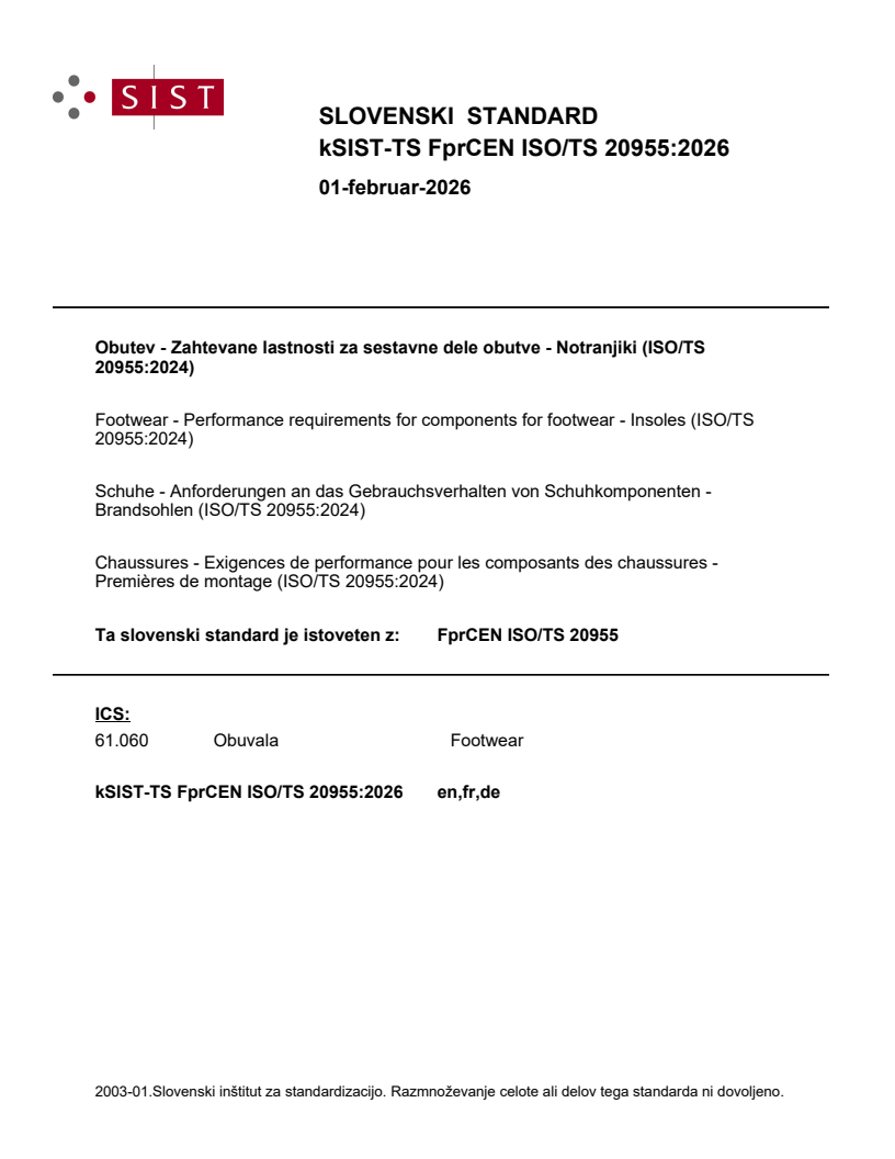 Obutev - Zahtevane lastnosti za sestavne dele obutve - Notranjiki (ISO/TS 20955:2024)