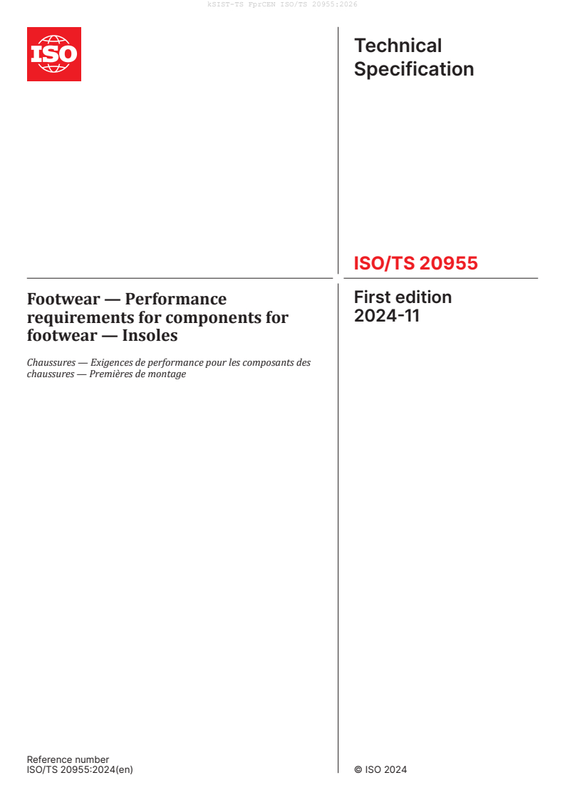 CEN ISO/TS 20955:2026 is a draft published by the European Committee for Standardization (CEN). Its full title is "Footwear - Performance requirements for components for footwear - Insoles (ISO/TS 20955:2024)". This standard covers: This document establishes the performance requirements for insole components for footwear in order to assess the suitability for the end use and/or fitness for purpose. It also establishes the test methods to be used to evaluate the compliance with the requirements. This document applies to insoles for all kinds of footwear as defined in Clause 4. This document can be used as a reference by the manufacturer and the supplier.