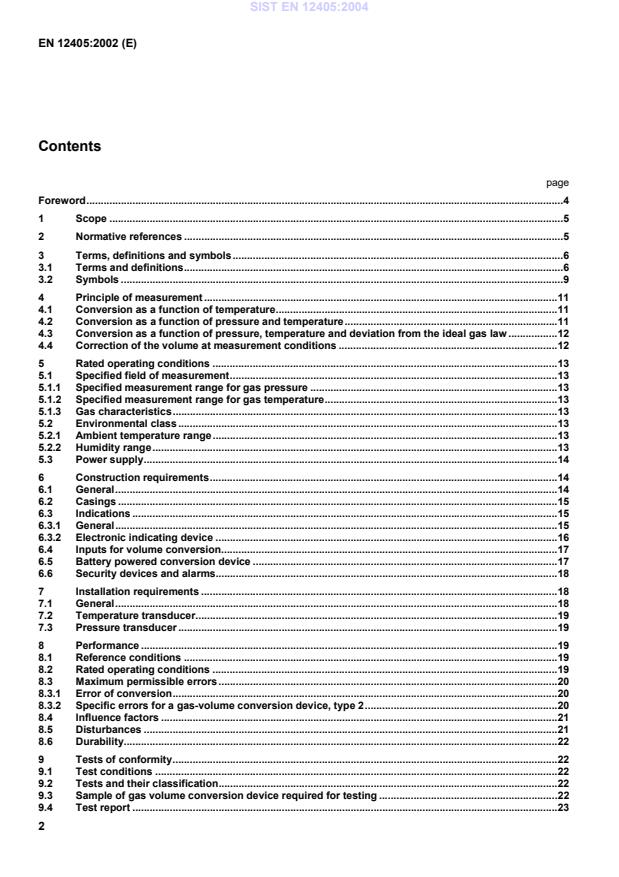 EN 12405:2002 is a standard published by the European Committee for Standardization (CEN). Its full title is "Gas meters - Gas-volume electronic conversion devices". This standard covers: This European Standard specifies the requirements and tests for the construction, performance, safety and conformity of gas-volume electronic conversion devices associated to gas meters, used to measure volumes of fuel gases of the 1st and 2nd families according to EN 437. Only three kinds of conversion are treated in this standard: - conversion as a function of temperature only (called T conversion); - conversion as a function of the pressure and of the temperature with constant compressibility factor (called PT conversion); - conversion as a function of the pressure, the temperature and taking into account the compressibility factor (called PTZ conversion). These gas-volume conversion devices consist of a calculator and a temperature transducer or a calculator, a temperature transducer and a pressure transducer locally installed. Any conversion device can provide an error curve correction for a gas meter. NOTE When rendering an account to an end user the readings from the conversion device can be used in conjunction with the readings from a gas meter conforming to EN 1359, prEN 12480, or prEN 12261, as appropriate, or to any other appropriate and relevant international or national standard for gas meters, without prejudice of national regulations. This standard is intended for type testing only. Annex A is normative and annex B is informative.