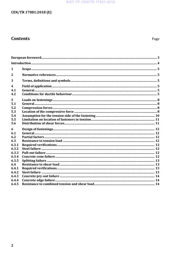 To tehnično poročilo zajema določbe za projektiranje skrajnih mejnih stanj dodatno k standardu EN 1992 4 za vezna sredstva z glavo in naknadno vgrajena vezna sredstva razen betonskih vijakov, ki zgolj prenašajo statična dejanja v beton, kadar so obremenitve posameznih veznih elementov določene v skladu s plastično analizo spoja, kjer so upoštevani samo uravnoteženi pogoji, ne pa tudi pogoji združljivosti. Utrujanje, sunki in seizmične obremenitve niso obravnavani.