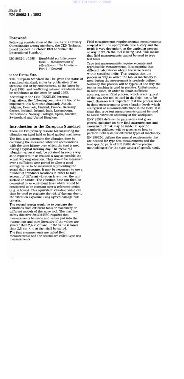 EN 28662-1:1992 is a standard published by the European Committee for Standardization (CEN). Its full title is "Hand-held portable power tools - Measurement of vibrations at the handle - Part 1: General (ISO 8662-1:1988)". This standard covers: Specifies the type test methods for the laboratory measurement of vibrations in the handles of tools. nThis part describes thebasic requirements for evaluating vibrations; it is not intended for assessment of human to vibrations.