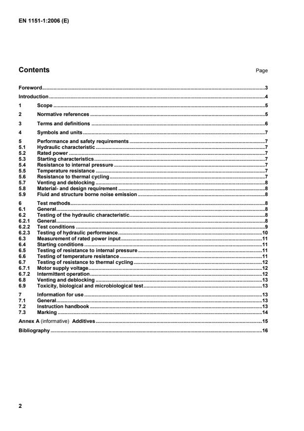 This part of EN 1151 establishes general principles for the construction, use and testing of circulation pumps of the glandless type, having a rated power input P1 £ 200 W, intended to be used in heating installations and domestic hot water service installations. NOTE The requirements of this document may apply to circulation pumps for domestic use having a rated power input above 200 W up to and including 300 W. However, this decision depends on agreement between the supplier and purchaser. Circulation pumps with a rated power input above 200 W for professional/commercial use are excluded from the scope of this document. This document applies to: a) A.C. circulation pumps having a rated power input P1 £ 200 W intended for use in ordinary heating water systems with a maximum permissible inlet temperature of TF £ 110 °C and a maximum outlet working pressure p2max o £ 6 bar. b) A.C. circulation pumps having a rated power input P1 £ 200 W intended for use in domestic hot water installations with a permissible inlet temperature of TF £ 65 °C and a maximum outlet working pressure p2max o £ 10 bar. This document applies to circulation pumps, which are manufactured after the date of issue of this document. This document covers the performance for circulation pumps. All known hazards which are likely to occur at normal installation and operation are covered by the European Standards EN 809 and EN 60335-2-51:2003. As regards safety for electrotechnical parts of circulation pumps, EN 60335-2-51:2003 applies. . This document covers the performance for circulation pumps. All known hazards which are likely to occur at normal installation and operation are covered by the European Standards EN 809 and EN 60335-2-51:2003. As regards safety requirements for electrotechnical parts of circulation pumps EN 60335-2-51:2003 applies.