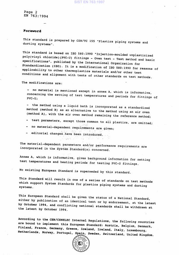 EN 763:1994 is a standard published by the European Committee for Standardization (CEN). Its full title is "Plastics piping and ducting systems - Injection-moulded thermoplastics fittings - Test method for visually assessing effects of heating". This standard covers: This standard specifies methods for visually assessing the effects of heating on injection-moulded thermoplastics fittings, including cracking or splitting induced by residual stress. It is applicable to fittings for pressure and non-pressure applications, e.g. flanged fittings, fittings incorporating elastomeric sealing rings and fittings consisting of the assembly of a number of moulded parts.