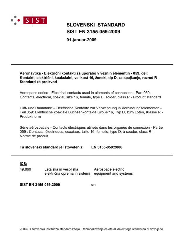 2003-01.Slovenski inštitut za standardizacijo. Razmnoževanje celote ali delov tega standarda ni dovoljeno.Luft- und Raumfahrt - Elektrische Kontakte zur Verwendung in Verbindungselementen - Teil 059: Elektrische koaxiale Buchsenkontakte Größe 16, Typ D, zum Löten, Klasse R - ProduktnormSérie aérospatiale - Contacts électriques utilisés dans les organes de connexion - Partie 059 : Contacts, électriques, coaxiaux, taille 16, femelle, type D, à souder, class R - Norme de produitAerospace series - Electrical contacts used in elements of connection - Part 059: Contacts, electrical, coaxial, size 16, female, type D, solder, class R - Product standard49.060Aerospace electric equipment and systemsICS:Ta slovenski standard je istoveten z:EN 3155-059:2006SIST EN 3155-059:2009en01-januar-2009SIST EN 3155-059:2009SLOVENSKI