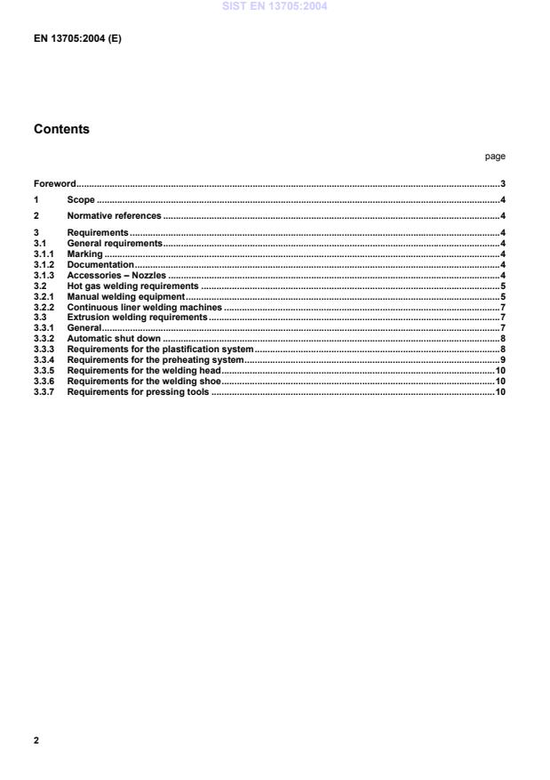 Keywords: EN 13705:2004, welding of thermoplastics, hot gas welding, extrusion welding, hot gas welding equipment, nozzles, plastification system, preheating system.