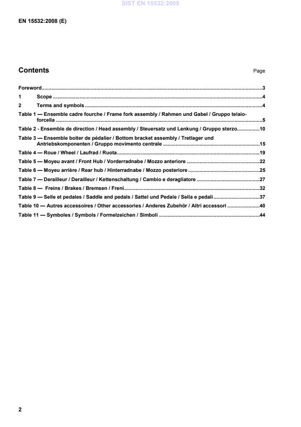 1 Scope This European Standard defines a description of common terms and symbols used in the field of bicycles. The terms are classified under a nomenclature of different parts of bicycles and presented in English, French, German, Dutch and Italian. 2 Terms and symbols 1) Frame-fork assembly 2) Head assembly 3) Bottom bracket and chains assembly 4) Wheel 5) Front hub 6) Rear hub 7) Derailleur 8) Brakes 9) Saddle and pedals 10) Other accessories 11) Symbols SIST EN 15532:2009