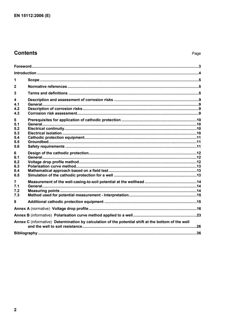 1 Scope This European Standard specifies methods used to evaluate the external corrosion hazards of well casings, as well as cathodic protection means and devices to be implemented in order to prevent corrosion of the external part of these wells in contact with the soil. This European Standard applies to any gas, oil or water well with metallic casing, whether cemented or not. However, in special conditions (shallow casing: e.g. 50 m, and homogeneous soil), EN 12954 can be used to achieve the cathodic protection and assess its efficiency. This European Standard also describes techniques allowing determination of the current required for protection and ensuring correct operation of the cathodic protection devices installed. 2 Normative references The following referenced documents are indispensable for the application of this document. For dated references, only the edition cited applies. For undated references, the latest edition of the referenced document (including any amendments) applies. EN 12954:2001, Cathodic protection of buried or immersed metallic structures — General principles and application for pipelines EN 60079-10, Electrical apparatus for explosive gas atmospheres — Part 10: Classification of hazardous areas (IEC 60079-10:2002) 3 Terms and definitions For the purposes of this document, the terms and definitions given in EN 12954 and the following apply (see also Figure 1). 3.1 casing (or well casing) heavy steel pipe string used to line a borehole from the ground surface, and secured in the formations generally by cementing NOTE Casing is generally externally cemented over its total depth or over a length sufficient to obtain anchoring and stability between the production or storage zone and the ground surface or other intermediate layers. This pipe string allows: - to prevent the ingress of fluid from upper strata; - to keep the hole from collapsing due to the pressure of the geological layers crossed; - to isolate the inside part of the well from the surrounding soil; - to continue drilling to the production or storage zone; - to drive down the tubing string from the surface to the production or storage zone. There may be two or more strings of casing, one inside the other, in a single well: