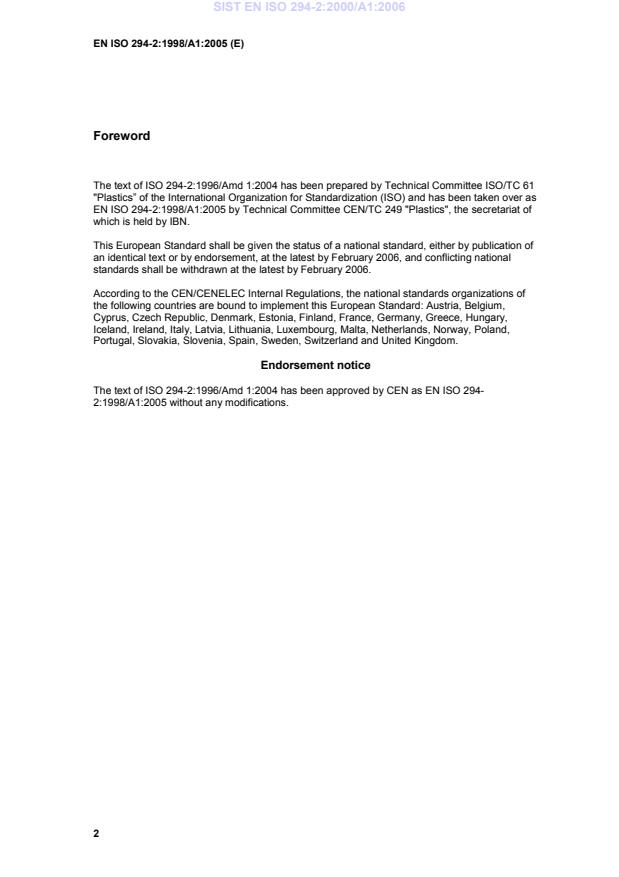 The text of ISO 294-2:1996/Amd 1:2004 has been approved by CEN as EN ISO 294-