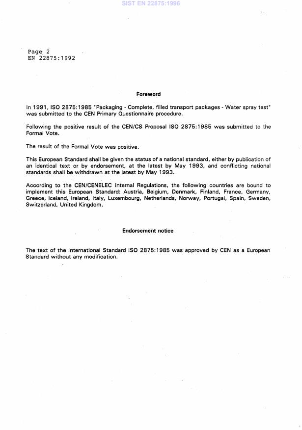 EN 22875:1992 is a standard published by the European Committee for Standardization (CEN). Its full title is "Packaging - Complete, filled transport packages - Water spray test (ISO 2875:1985)". This standard covers: Packaging - Complete, filled transport packages - Water spray test (ISO 2875:1985)