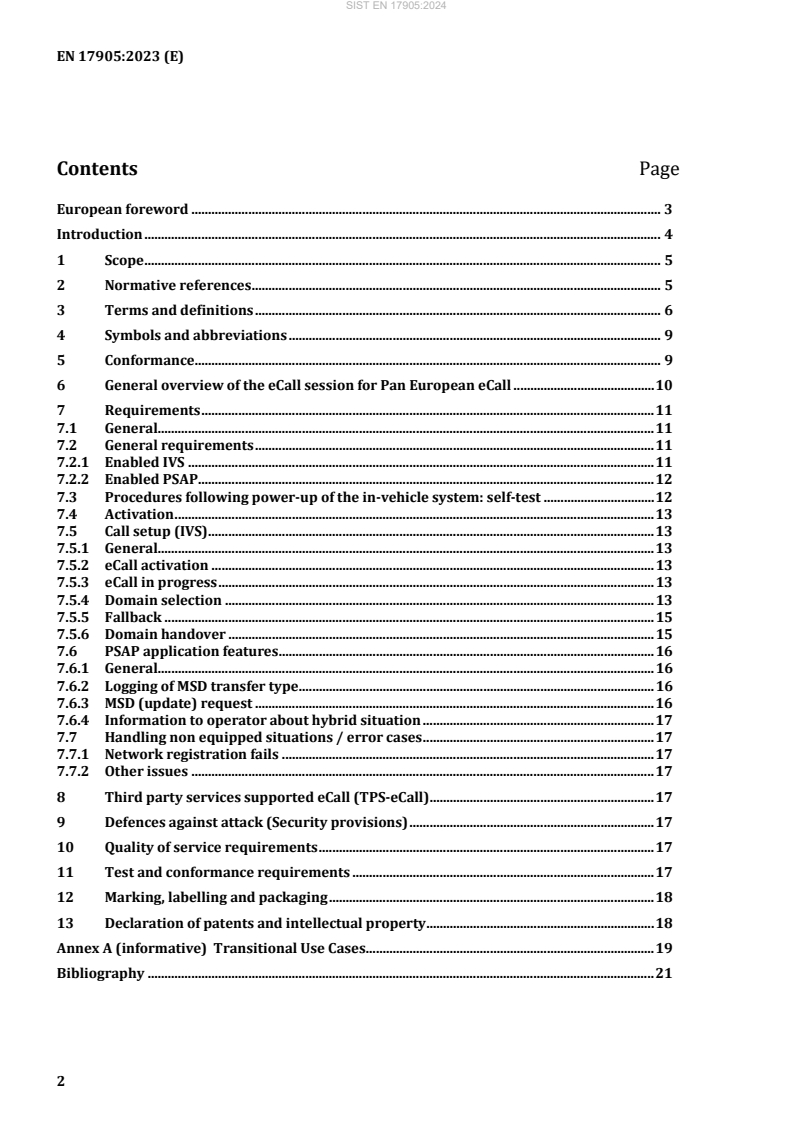 EN 17905:2023 is a standard published by the European Committee for Standardization (CEN). Its full title is "Intelligent transport systems - eSafety - eCall HLAP in hybrid circuit switched/packet switched network environments". This standard covers: In respect of 112-eCall (pan-European eCall) (operating requirements defined in EN 16072), this document defines the additional high level application protocols, procedures and processes required to provide the eCall service whilst there are still both circuit switched and packet switched wireless communication networks in operation. NOTE The objective of implementing the pan-European in-vehicle emergency call system (eCall) is to automate the notification of a traffic accident, wherever in Europe, with the same technical standards and the same quality of services objectives by using a PLMN (such as ETSI prime medium) which supports the European harmonized 112/E112 emergency number (TS12 ETSI TS 122 003 or IMS packet switched network) and to provide a means of manually triggering the notification of an emergency incident.