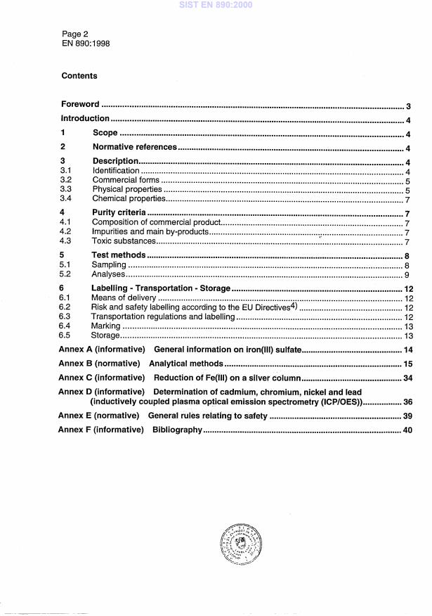 EN 890:1998 is a standard published by the European Committee for Standardization (CEN). Its full title is "Chemicals used for treatment of water intended for human consumption - Iron (III) sulfate". This standard covers: This European Standard is applicable to iron(III) sulfate of various iron and/or (see 3.2) used for treatment of water intended for human consumption. It describes the characteristics of iron (III) sulfate and specifies the requirements and the corresponding analytical methods for iron (III) sulfate and gives information on its use in water treatment.