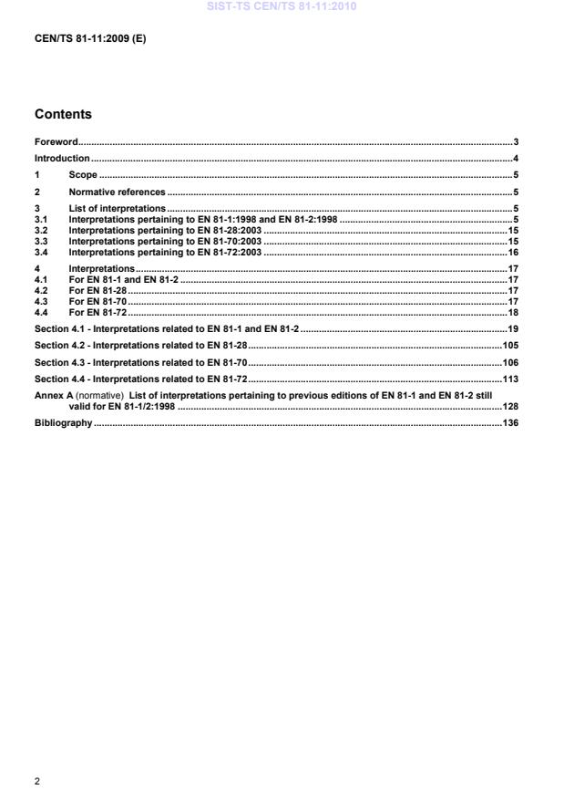 Ta tehnična specifikacija je zbirka razlag, povezanih z družino standardov EN 81 (glej CEN/TR 81-10:2008). V prvi izdaji tega dokumenta so zbrane razlage EN 81-1:1998, EN 81-2:1998, EN 81- 28:2003, EN 81-70:2003 in EN 81-72:2003. Razlage drugih standardov družine EN 81 se bodo dodajale, ko bodo na voljo. Razlage so namenjene boljšemu razumevanju klavzul, na katere se sklicujejo, s čimer se poveča splošno razumevanje med proizvajalci, monterji dvigal, priglašenimi organi, nadzornimi organi in nacionalnimi organi. Razlage nimajo enakega statusa kot standardi, s katerimi so povezane. Uporaba razlag bi morala zainteresiranim stranem dati zaupanje, da ustrezni standard ni bil napačno uporabljen.