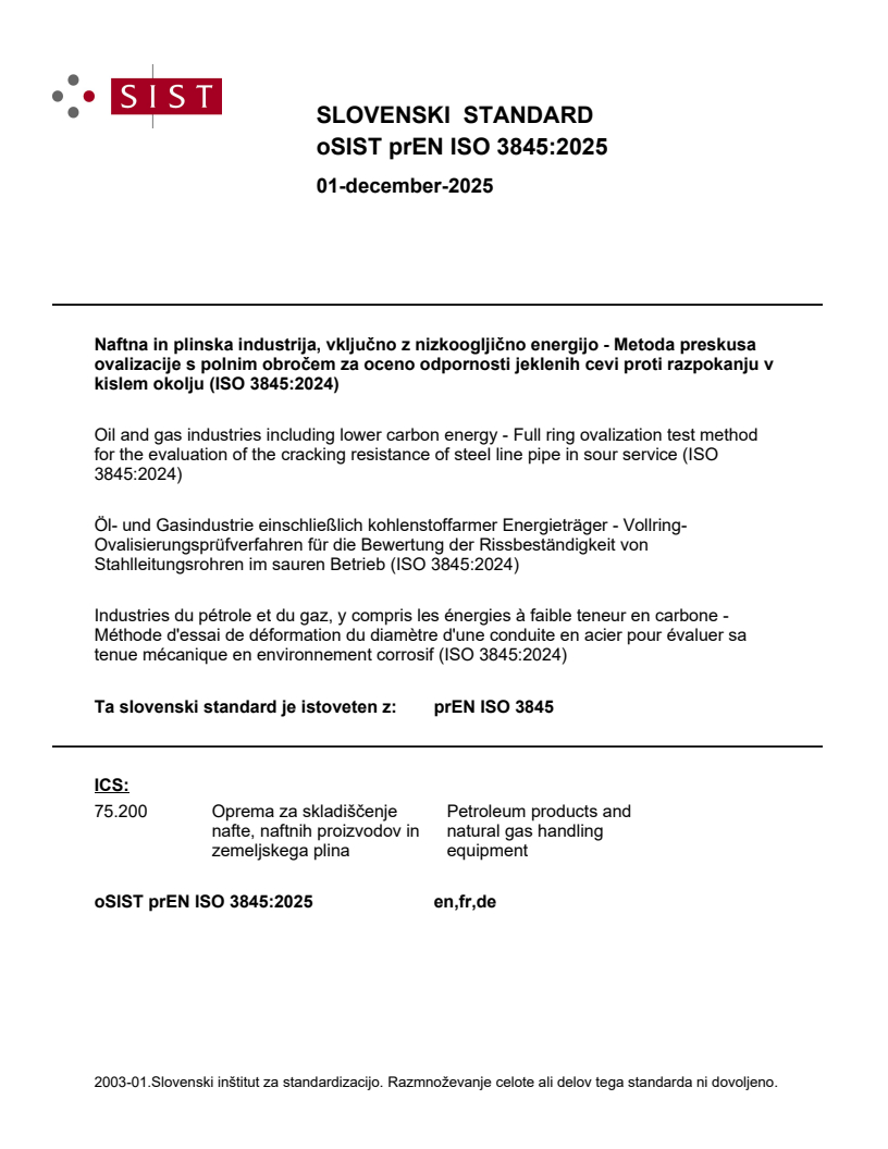 Naftna in plinska industrija, vključno z nizkoogljično energijo - Metoda preskusa ovalizacije s polnim obročem za oceno odpornosti jeklenih cevi proti razpokanju v kislem okolju (ISO 3845:2024)