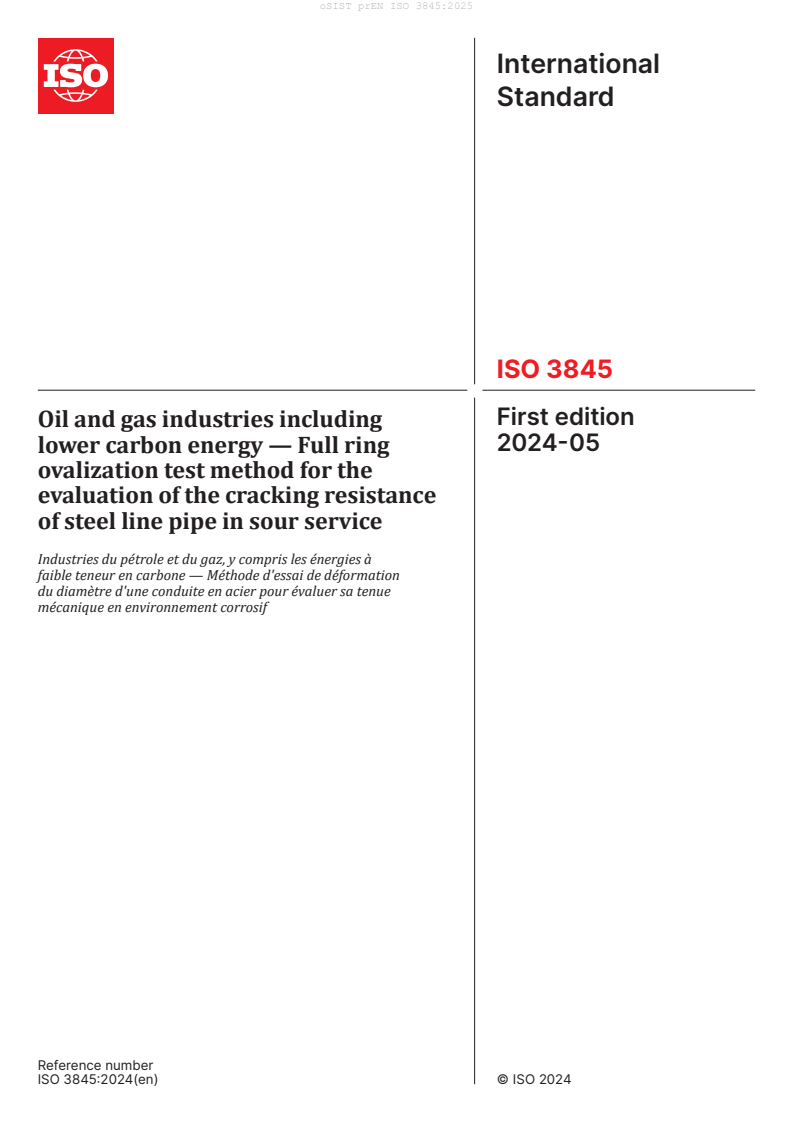prEN ISO 3845 / ISO 3845:2024 - titled Full ring ovalization test method for the evaluation of the cracking resistance of steel line pipe in sour service - is a CEN-adopted international standard for the oil and gas industries (including lower carbon energy). It defines a full-scale laboratory test that evaluates the susceptibility of steel line pipe (and associated tubular components or welds) to sour service cracking caused by wet hydrogen sulfide (H2S). The method uses a sealed short-length “full ring” specimen, mechanically ovalized to impose a known hoop stress at two diametrically opposite internal locations, followed by single-sided exposure to a sour test environment. The test also supports hydrogen permeation measurements and periodic in-situ inspection.