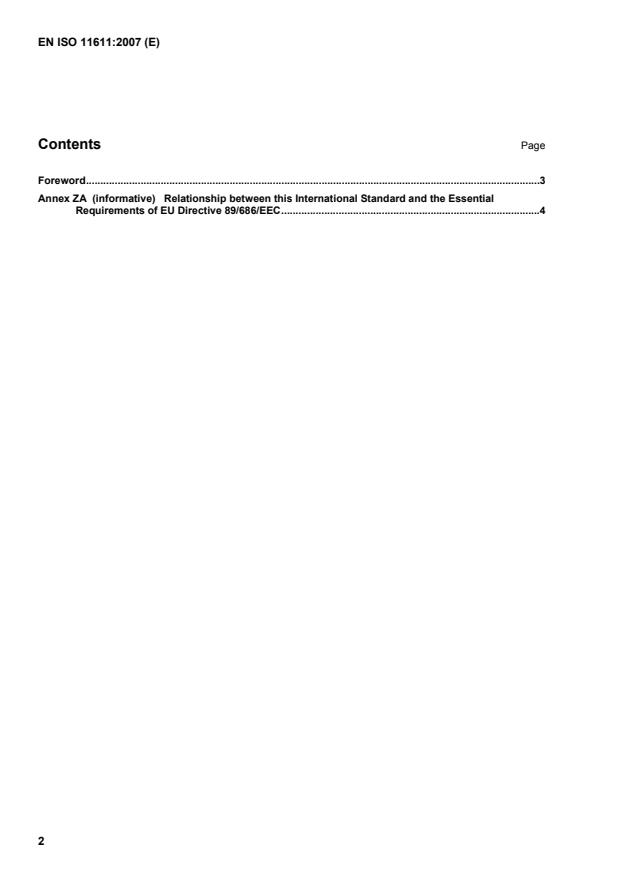ISO 11611:2007(E) © ISO 2007 – All rights reserved iiiContents Page Foreword.iv 1 Scope.1 2 Normative references.1 3 Terms and definitions.2 4 Design.4 4.1 General.4 4.2 Sizes.4 4.3 Pockets.4 4.4 Closures and seams.5 5 Sampling and pre-treatment.5 5.1 Sampling.5 5.2 Pre-treatment of material.5 5.3 Conditioning.5 6 General safety requirements.6 6.1 Tensile strength.6 6.2 Tear strength.6 6.3 Burst strength of knitted materials.6 6.4 Seam strength.6 6.5 Dimensional change of textile materials.6 6.6 Requirements for leather.6 6.7 Flame spread.6 6.8 Impact of spatter.7 6.9 Heat transfer (radiation).7 6.10 Electrical resistance.7 6.11 Innocuousness.8 6.12 Summary of general safety requirements.8 7 Marking.9 8 Information supplied by the manufacturer.9 8.1 General.9 8.2 Intended use.9 8.3 Improper use.10 8.4 Care and maintenance.10 Annex A (informative)