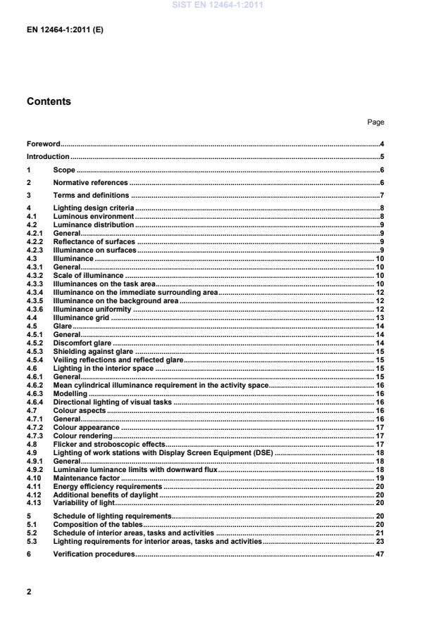 Diese Europäische Norm legt Anforderungen an die Beleuchtung von Arbeitsstätten in Innenräumen fest, die den Erfordernissen für Sehkomfort und Sehleistung für Menschen mit normalem Sehvermögen gerecht werden. Alle üblichen Sehaufgaben, einschließlich derjenigen am Bildschirm, werden berücksichtigt. Diese Europäische Norm legt für die meisten Arbeitsstätten in Innenräumen und deren zugehörigen Flächen die Anforderungen an Beleuchtungslösungen hinsichtlich Quantität und Qualität der Beleuchtung fest. Zusätzlich werden Empfehlungen für die Umsetzung guter Beleuchtung gegeben. Diese Europäische Norm legt keine Anforderungen an die Beleuchtung von Arbeitsstätten fest im Hinblick auf Sicherheit und Gesundheit der Beschäftigten bei der Arbeit und wurde nicht im Anwendungsbereich von Artikel 153 der Europäischen Verträge erarbeitet, obwohl die lichttechnischen Anforderungen, die in dieser Europäischen Norm festgelegt sind, üblicherweise auch Anforderungen im Hinblick auf Sicherheit erfüllen. Anforderungen an die Beleuchtung von Arbeitsstätten im Hinblick auf Sicherheit und Gesundheit der Beschäftigten bei der Arbeit können in Richtlinien enthalten sein, die auf Artikel 153 der Europäischen Verträge basieren, in der nationalen Rechtsetzung der Mitgliedstaaten in Umsetzung dieser Direktiven oder in anderer nationaler Rechtsetzung der Mitgliedstaaten. Diese Europäische Norm legt weder bestimmte Lösungen fest, noch schränkt sie die Freiheit der Planer ein, neue Techniken zu erkunden, und schränkt auch nicht den Gebrauch innovativer Beleuchtungsanlagen ein. Die Beleuchtung kann durch Tageslicht, künstliches Licht oder eine Kombination von beiden erfolgen. Diese Europäische Norm ist nicht anwendbar für die Beleuchtung von Arbeitsstätten im Freien und im Untertage-Bergbau oder für Notbeleuchtung. Für Arbeitsstätten im Außenbereich siehe EN 12464-2 und für Notbeleuchtung siehe EN 1838 und EN 13032-3.
