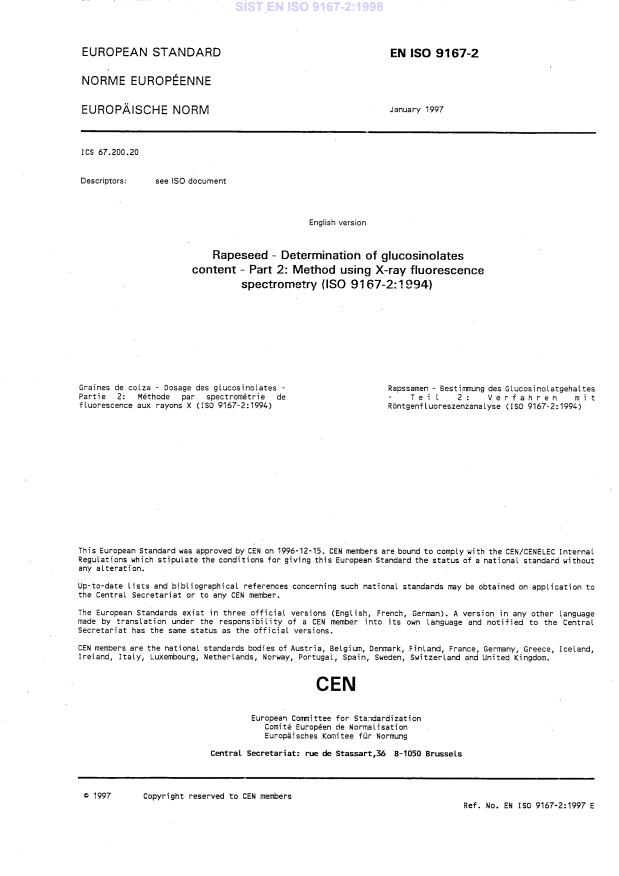 Seme oljne repice - Določevanje glukozinolatov - 2. del: Rentgenska spektrometrijska metoda (ISO 9167-2:1994)