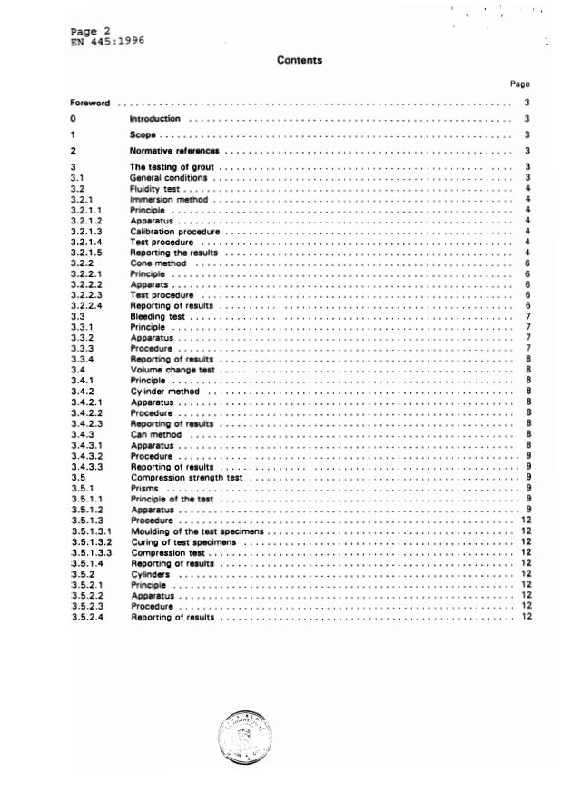 EN 445:1996 is a standard published by the European Committee for Standardization (CEN). Its full title is "Grout for prestressing tendons - Test methods". This standard covers: This European Standard describes the methods of test for grout specifies in EN 447.