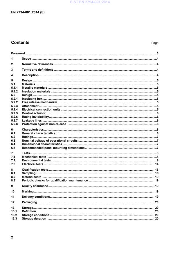 Contents Page Foreword .3 1 Scope .4 2 Normative references .4 3 Terms and definitions .4 4 Description .4 5 Design .5 5.1 Materials .5 5.1.1 Metallic materials .5 5.1.2 Insulation materials .5 5.2 Design .5 5.2.1 Insulating box .5 5.2.2 Free release mechanism .5 5.2.3 Attachment .5 5.2.4 Electrical connection units .5 5.2.5 Control actuator .6 5.2.6 Rating inviolability .6 5.2.7 Leakage lines .6 5.2.8 Protection against non-release .6 6 Characteristics .6 6.1 General characteristics .6 6.2 Ratings .7 6.3 Nominal voltage of operational circuits .7 6.4 Dimensional characteristics .7 6.5 Recommended panel mounting dimensions .7 7 Tests .8 7.1 Mechanical tests .8 7.2 Environmental tests .9 7.3 Electrical tests . 14 8 Qualification tests . 16 8.1 Sampling . 16 8.2 Material tests . 19 8.3 Periodic checks for qualification maintenance . 19 9 Quality assurance . 19 10 Marking . 19 11 Delivery conditions . 19 12 Packaging . 20 13 Storage . 20 13.1 Definition . 20 13.2 Storage conditions . 20 13.3 Storage duration . 20