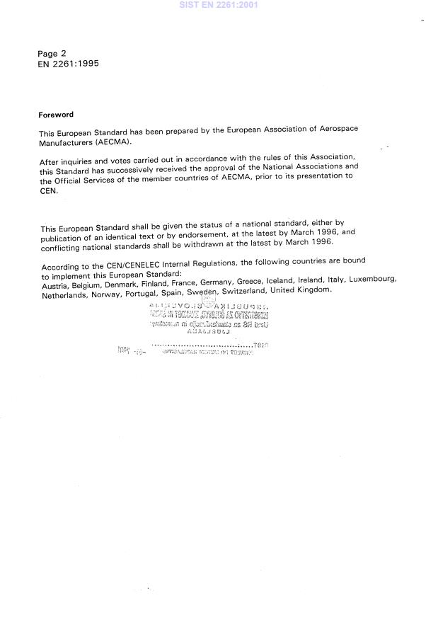 - EN 2261:1995 is part of the CEN aerospace series; consult national adoptions (e.g., SIST EN 2261:2001) and complementary standards for specific test methods, temperature ratings, or system-level qualification criteria.