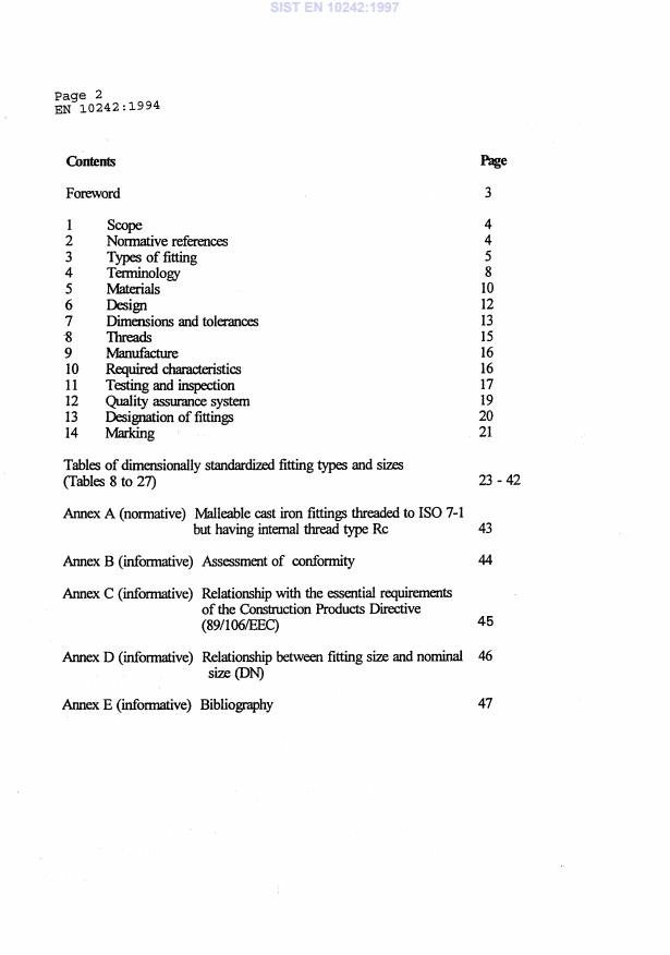 EN 10242:1994 is a standard published by the European Committee for Standardization (CEN). Its full title is "Threaded pipe fitting in malleable cast iron". This standard covers: This standard specifies the requirements for the design and performance of threaded pipe fittings in malleable cast iron. These fittings are for general purposes for the transmission of fluids and gases up to the limits of pressure and temperature specified in this standard. They are intended for the connection of elements threaded in accordance with ISO 7-1, sizes 1/8 to 6. For use in conditions outside the pressure and temperature limits specified, reference shall be made to the manufacturer.