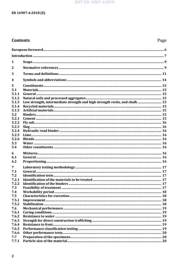 Ta evropski standard se uporablja za tretiranje naravnih zemljin, šibkih in vmesnih kamnin (vključno s kredo), recikliranih materialov ter umetnih materialov z vezivi za izvajanje zemeljskih del med gradnjo in vzdrževanjem cest, železnic, letaliških stez, platform, zadrževalnih nasipov, ribnikov ter drugih vrst zemeljske strukture. Nanaša se samo na obdelavo po slojih za zemeljska dela, za razliko od na primer obdelave po stebrih. Standard določa zahteve za sestavine zmesi, metodologijo za začetno laboratorijsko testiranje, klasifikacijo usposobljenosti laboratorija ter izvajanje in nadzor. Opomba 1: Informativni dodatki navajajo tudi primere dobrih praks pri izvajanju in nadzoru. Klasifikacija usposobljenosti laboratorija, določena v tem evropskem standardu, zajema dve vrsti obdelave: izboljšavo in stabilizacijo. − Za izboljšavo klasifikacija upošteva kratkoročno usposobljenost. − Za stabilizacijo klasifikacija upošteva srednje- do dolgoročno usposobljenost. Opomba 2: Za stabilizacijo klasifikacija temelji na klasifikaciji usposobljenosti laboratorija, določeni v standardu EN 14227-15, razen za klasifikacijo v skladu z Rt in E, ki jo je nadomestila klasifikacija usposobljenosti v skladu z Rt in E, značilna za zemeljska dela.
